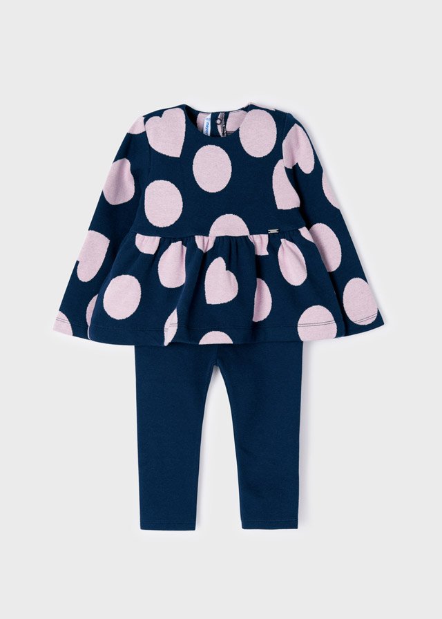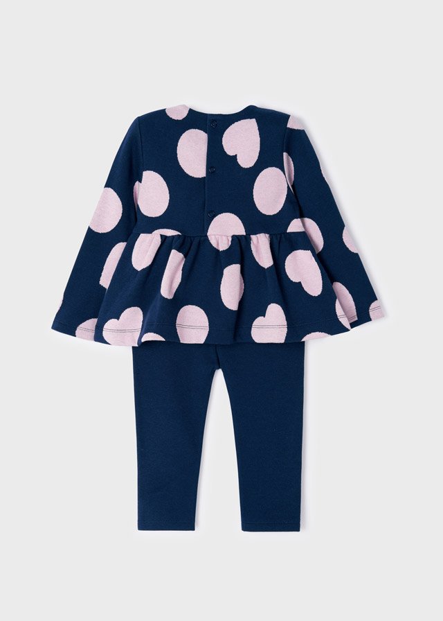 Two piece set made up of a t-shirt and leggings for baby. Long sleeved T-shirt for baby. Round neckline. Small opening on the back with a button fastening to allow the garment to be put on easily. Leggings for baby.