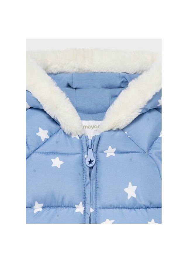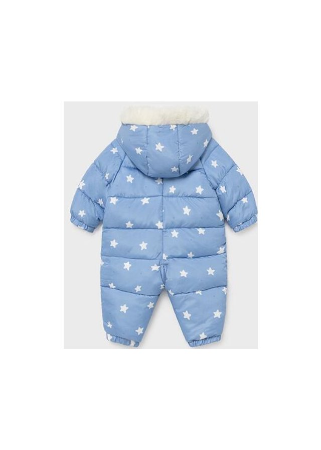 Oblečení ECOFRIENDS 100% recyklovaný polyester. Kočárek s dlouhým rukávem pro novorozenou holčičku od 0 do 18 měsíců. Límec s kapucí Kapuce s detaily z umělé kožešiny. Přední, centrální zapínání na zip. Odnímatelné rukavice. Vzorovaný design. Jemné botičky, které ochrání nožičky vašeho dítěte.